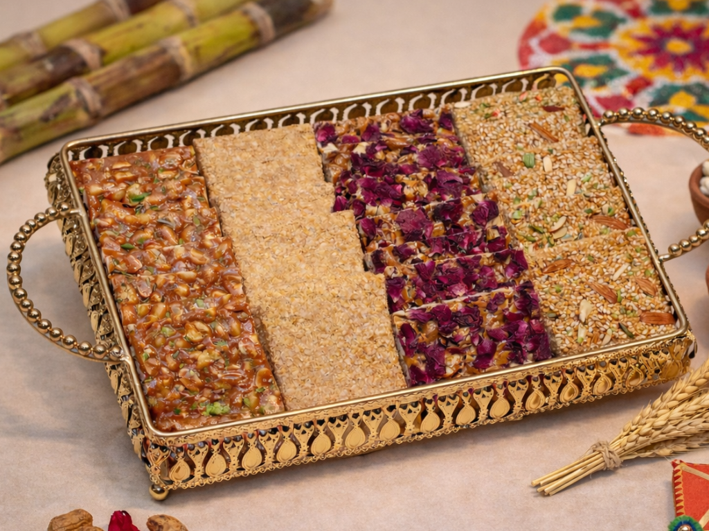 Go to the shopA luxurious assortment of peanut and til gajaks, including rose-infused delights, beautifully presented in a premium golden tray.
