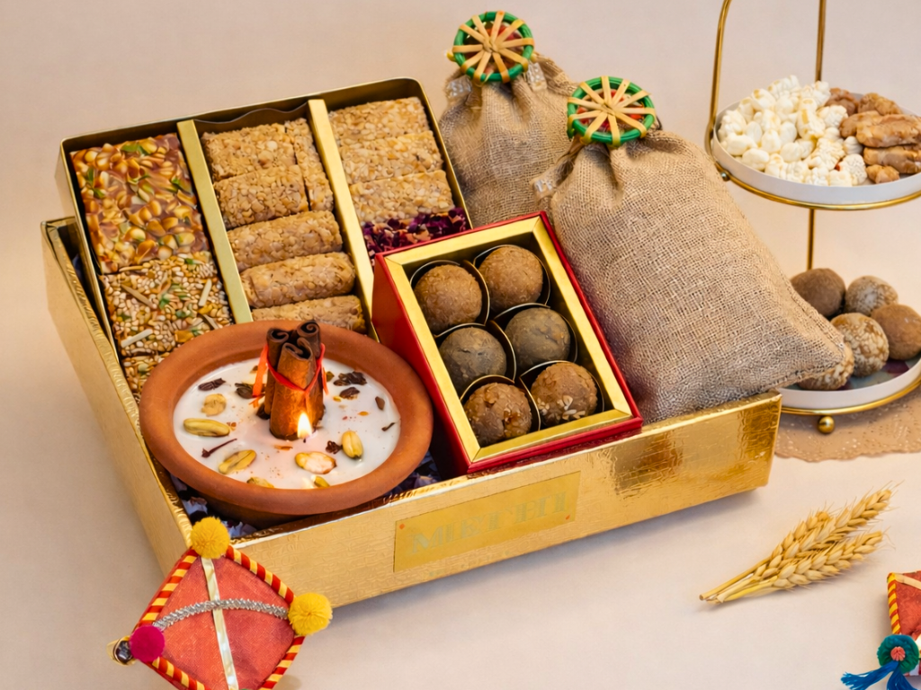 A thoughtfully curated Lohri hamper featuring assorted gajaks, nourishing laddoos, a signature handcrafted festive candle, and rustic jute potlis filled with popcorn and groundnuts. Together, these elements celebrate the warmth, tradition, and joy of Lohri in a beautifully indulgent way.